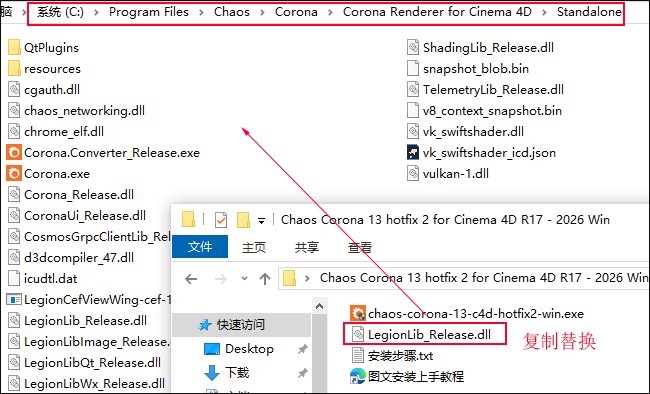 1、下载解压,得到c4d实时交互渲染器Corona Renderer for Cinema 4D R17-2026,以及补丁文件LegionLib_Release.dll;
