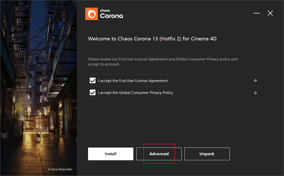 2、首先双击chaos-corona-13-c4d-hotfix2-win.exe文件开始安装,接受协议后,选择Advanced;