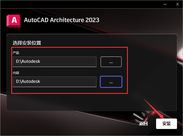 4、选择安装位置,点击…进去更改安装位置(请注意:更改的路径不能带有中文或者特殊符号),建议是产品和内容都是安装在同一个路径里面,然后点击安装;