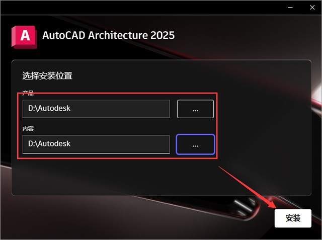 3、选择安装位置,点击…进去更改安装位置(请注意:更改的路径不能带有中文或者特殊符号),建议是产品和内容都是安装在同一个路径里面,然后点击安装;