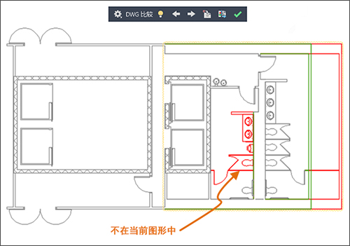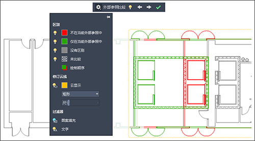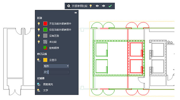 “比较”功能的主要增强功能是,现在可以比较和查看对图形文件(作为外部参照 (xref) 附着在当前图形中)所做的更改。对参照图形或比较图形所做的任何更改均会使用修订云线亮显。
