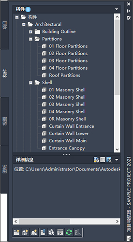 项目是由表示建筑模型设计和文档中不同构件的图形文件组成的。有许多表示建筑各个部分(例如单个建筑楼层或某一楼层的框架构件)的图纸。这些图形被引用到更复杂的图形中,例如,将所有单层图纸引用到显示建筑模型完整视图的图形显示中。从这些视图图形中,可以创建项目剖面、立面和带注释打印图纸的其他图形。项目中的所有图形都在项目导航器中显示和组织。