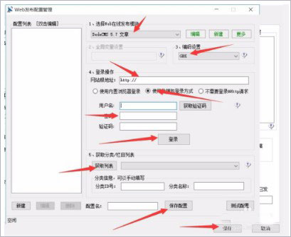 10、配置网站后台的登陆信息和要发布的栏目,然后保存配置 ,全部保存,就OK了,可以正式批量采集文章了。