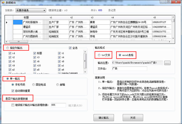 5、默认的导出数据设置,是只导出单一的电话号码,并自动排除重复手机号。如果需要完整数据,请在弹出的对话框中,选择“指定列输出”。