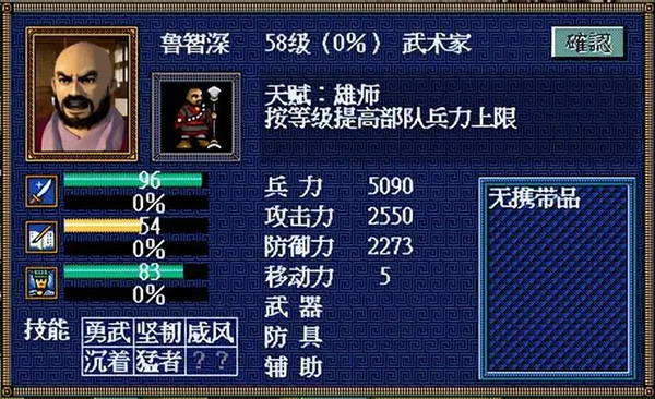 水浒传另一位乱入人物。没显示的最后一个技能是“雄狮”。天赋“治疗”只适合前期,中后期作用不大。“雄狮”出现有点晚,加上统御只74,防御力有限;41的智力不能很好使用武术家的火系策略。评价是B,替补。