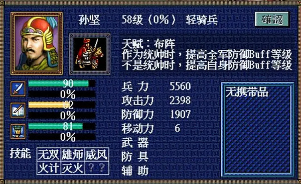 同样是有着优秀统武的武将。天赋“布阵”如果是作为统帅就非常有用。没有显示的最后技能是“水计”。作为一个骑兵职业选手,一半技能是策略,这个完全就是浪费。小编认为实用性评价C,唯一作用就是对东吴的时候派出场恶心一下孙权吧,^_^。