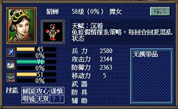 本来是个军乐队吧,如此低的武力,却因为连击技能(一次打别人2次)有着不错的伤害。因为有防御天赋,很抗打的。甚至我比电脑低了7-8级,电脑愣是在旁边休息,也不愿意出手打貂蝉。