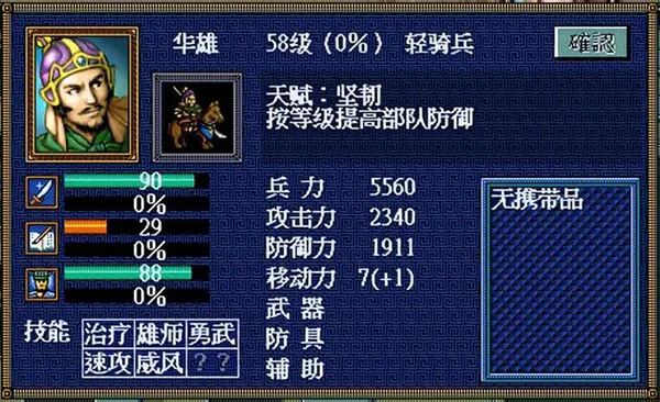 攻击算合格,防御比较出色。首先天赋“虎视”可免疫攻击类策略,这是直面敌人妖术师们的最佳人选,只有40较低的智力可以无视了。技能“雄狮”可提高生命;“坚韧”和“背水”可提高防御;“反击”和“报复”增加反击率,不过攻击力有限而效果一般;没显示的最后一个技能是“攻心”可以吸收敌人兵力到自己,这个非常提高续航。可以说只要等级能上去,他是我军坚实的肉盾,尤其是雒城之战等急需保护我军重要人物的关卡。