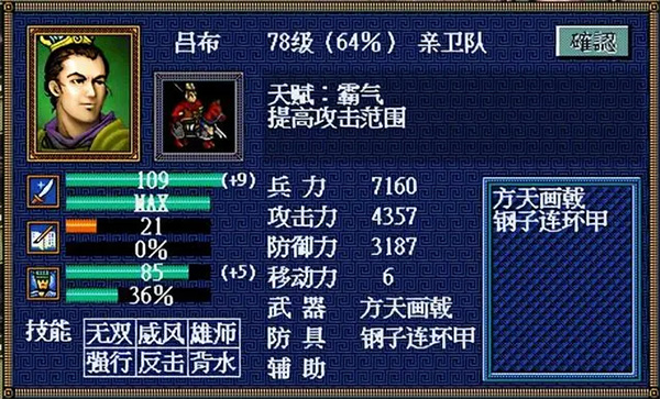 技能中“雄狮”提高生命上限;“威风”提高士气上限;“无双”与“背水”都提高攻防;“强行”可以突击移动;“反击”可提高反击率,但凡要物理攻击吕布的恐怕都要三思。唯一不足就是智力太低。