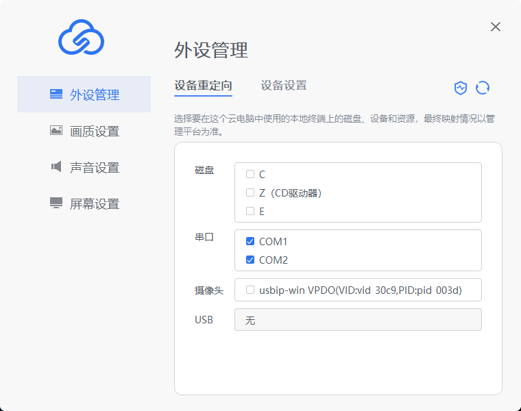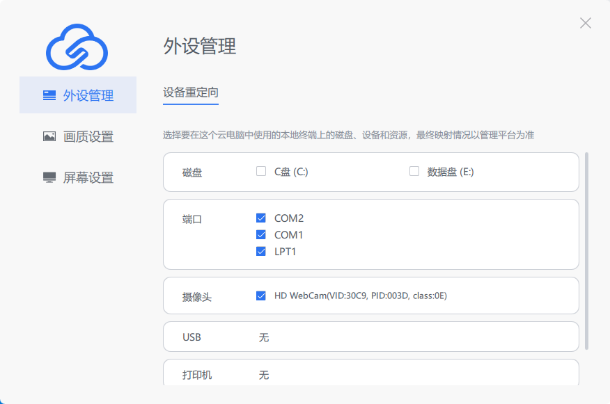 设备重定向页面可显示当前终端上可使用的磁盘、外设设备以及被禁用设备。勾选磁盘或外设设备后,即可在云电脑中使用本地磁盘或设备。