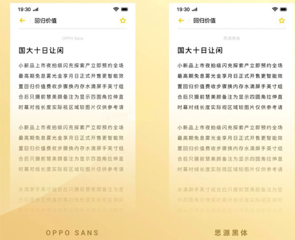OPPO Sans相对于思源黑体,字体大小收窄,字怀也收窄了,整体感觉更轻盈,密集阅读体验会舒服。也是配合ColorOS 6整体无边界简明的UI风格。
