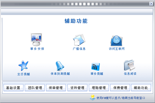 7、辅助功能包括事务安排、广播信息、访问互联网、生日提醒、保单到期提醒、事务提醒、信息阅读等选项,如图: