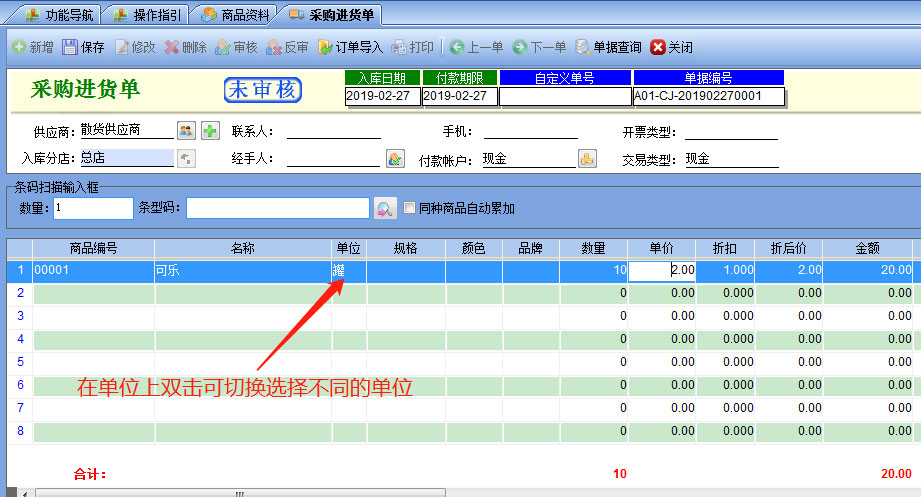 采购进货开单时调出商品后,也可以在单位上双击进行不同的单位选择,也可以直接扫描对应的条码自动调出不同的单位。