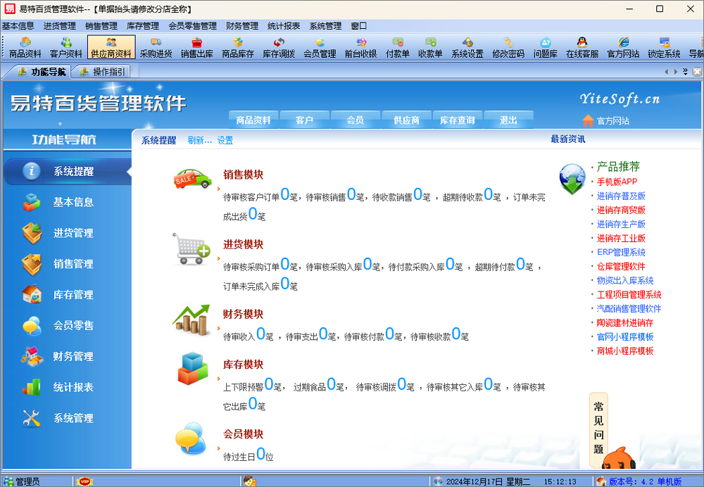 易特百货管理软件是一款专业的百货商品销售管理软件,界面设计美观、简洁,让普通用户不用培训也可以很快掌握操作方法,上手极易。支持POS销售、会员管理、设置最低售价,支持手工盘点(直接输入需要盘点的商品)、自动盘点(直接按商品类别提取库存)及盘点机盘点,具有商品销售管理系统 ,库存管理系统(仓库管理系统),财务和报表系统等子模块。