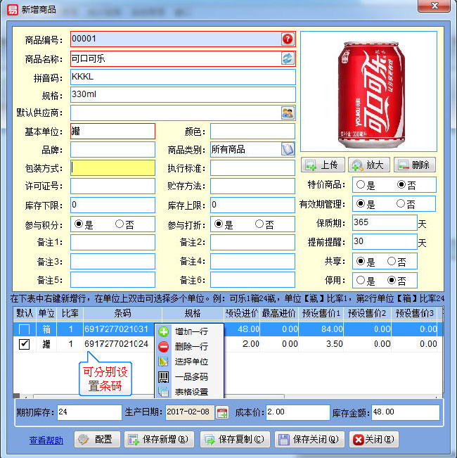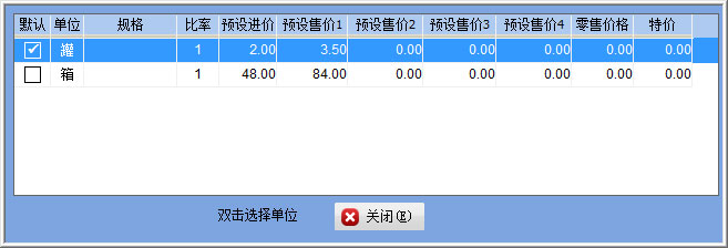 选择好基本单位【罐】下图表格是自动增加一行单位为【罐】的默认单位,可设置罐装的条码及售价信息,然后在表格上右键【增加一行】然后在单位上双