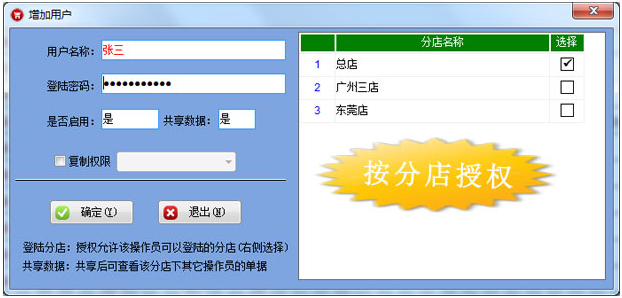 可单店用,多店用,基本资料可共享或私有化(即同一个商品及客户是否其它店面可用) ,门店间调拨,分门店设置商品的售价(即不同门店使用不同的销售价格),分门店设置商品的最高库存与最低库存并可以分门店自动显示库存报警等。