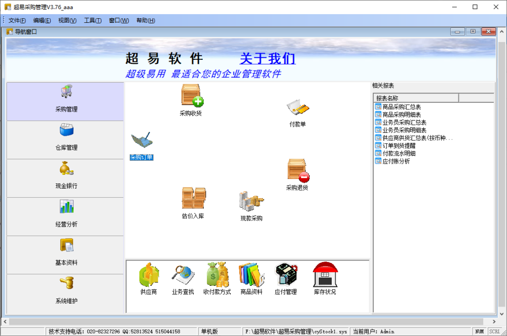 超易采购管理软件是一款非常给力的采购管理软件,功能强大、操作简单,是每一位厂家必备的管理工具!主要功能分为采购管理、仓库管理、财务管理、基本资料和权限管理五部分,完美的支持Excel批量导入盘点信息、Excel导入商品资料信息、批单收款,批单付款、支持拼音码、中文汉字、编码等模糊输入模式等,能够帮助用户提高贵公司的采购业务的管理水平!