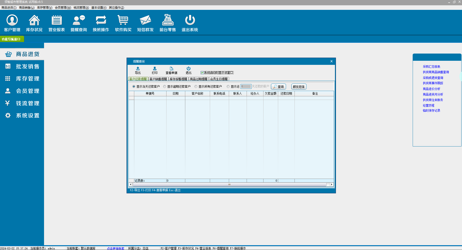 15、提醒功能,每次软件启动时可以弹出提醒窗口,提醒的内容分为客户还款提示、库存报警提醒、商品过期提醒。