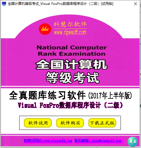 全国计算机等级考试二级vfp全真模拟考试软件是科慧尔软件专为二级Visual FoxPro数据库而开发的一款模拟考试系统,又俗称为计算机二级vfp模拟软件,按照最新《全国计算机等级考试二级Visual FoxPro数据库程序设计考试大纲》研发而成,具有自动计时、随机抽题、全真模拟、精选习题、详尽解析等功能,同时包含了近年历次考试真题,适合参加全国计算机等级考试人员和所有学习程序设计基础理论及Visual FoxPro数据库程序设计的人员使用,欢迎免费下载。