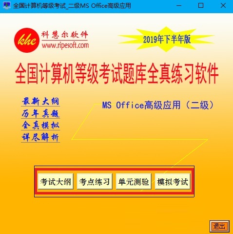 二级office考试系统是按照最新《全国计算机等级考试二级MS Office高级应用考试大纲》研发而成,由科慧尔软件重磅开发的一款无纸化计算机等级考试二级模拟软件,内容包括了最新大纲、历年真题,全真模拟、详尽解析四大功能,可以帮助广大学员更好的复习,从而轻松通过考试。该版本软件系统具有自动计时、随机抽题、全真模拟、精选习题、详尽解析等功能,其中包含近年历次考试真题,适合参加全国计算机等级考试人员和所有学习计算机基础操作、MS Office及上网的人员使用。软件分为两种类型:全面练习版和模拟考试版,全面练习版适合无基础或基础差的考生使用,可以使用软件中所有试题,包括同步训练、测验评析、模拟考试三部分试题。