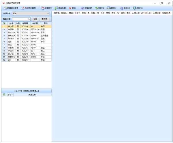 4、住院病历管理:实现患者整个住院过程的入院记录、病程记录、手术记录、术前小结、术后病程记录、出院记录等的病历管理。