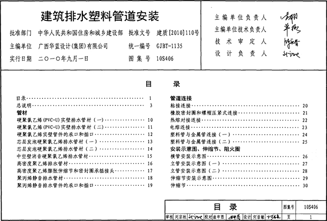 为便于设计和施工人员选用,10s406建筑排水塑料管道安装图集首先编制了管材的性能及接口,再逐步对各种管材的施工及安装进行阐述。图纸部分主要编制了管材及管件的规格、尺寸和壁厚;粘接连接、橡胶密封圈连接、螺帽压紧式连接、热熔对接、电熔连接、机械连接等安装详图;系统安装示意图;伸缩节、阻火圈等大样图;管道穿楼板、屋面、承重墙等节点详图及管件详图等,设计人员可直接选用,施工人员可照图施工。