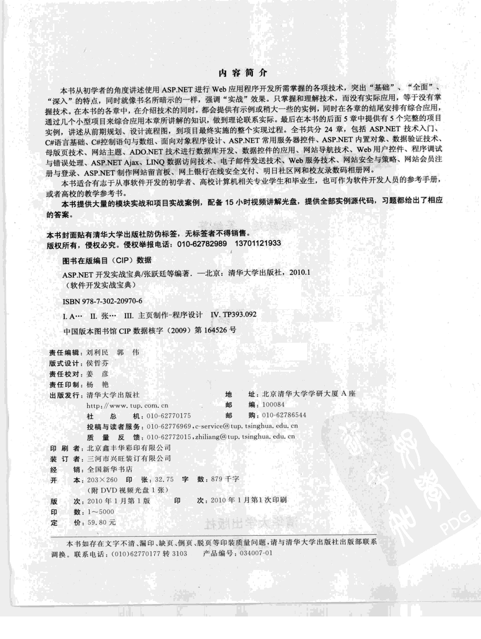 《asp.net开发实战宝典》共分24章,包括ASP.NET技术入门、C#语言基础、C#控制语句与数组、面向对象程序设计、ASP.NET常用服务器控件、ASP.NET内置对象、数据验证技术、母版页技术、网站主题、ADO.NET技术进行数据库开发、数据控件的应用、网站导航技术、Web用户控件、程序调试与错误处理、ASP.NET Ajax、LINQ数据访问技术、电子邮件发送技术、Web服务技术、网站安全与策略、网站会员注册与登录、ASP.NET制作网站留言板、网上银行在线安全支付、明日社区网和校友录数码相册网。