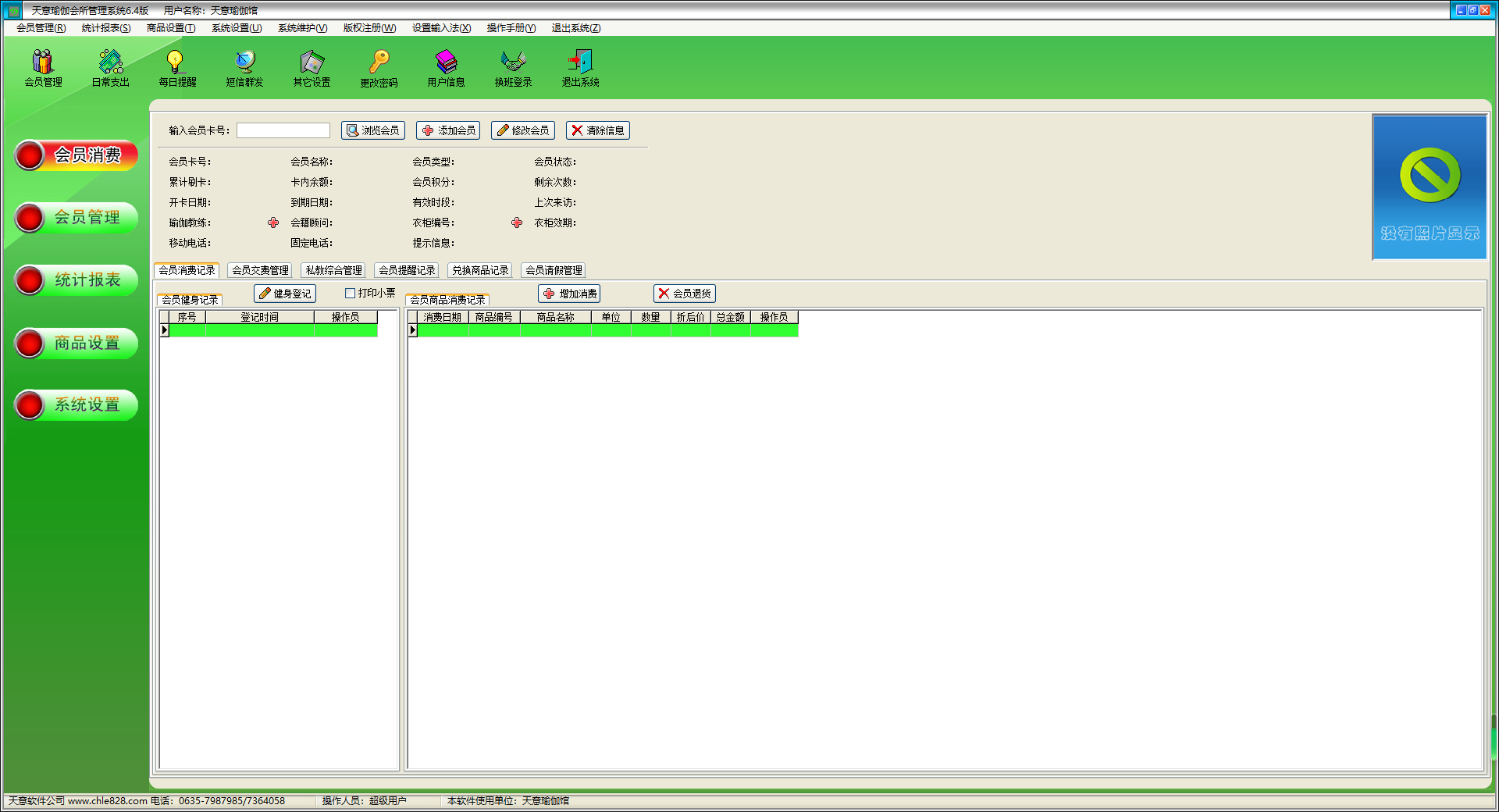 该功能可以对会员刷卡登记和会员消费店内商品进行管理。同时也可以管理兑换商品、充值、私教。