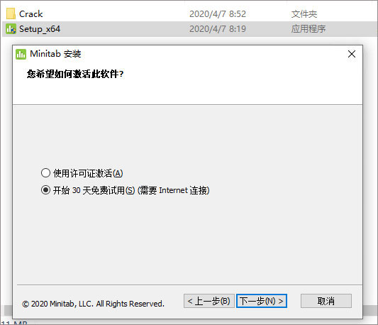 1、将下载好的压缩文件解压,得到minitab2020中文原文件和crack破解文件夹;