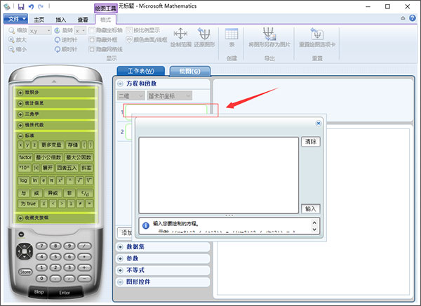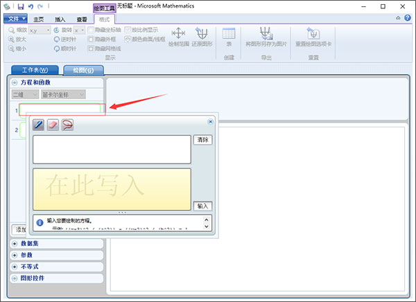 4、在键盘的模式下,点击绘图,点击框选空白区域,输入你想要绘制的方程。