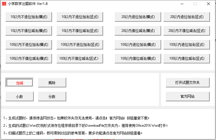 值得一提的是,小学数学出题软件的使用方法也非常简单,用户只要按照需求点击按钮即可生成对应的试题文件,打开以后可直接打印,扫描每份试题上的二维码即可查看对应的参考答案。简单方便,可根据用户需求定制试题,绿色免费,有需求的用户请下载体验。