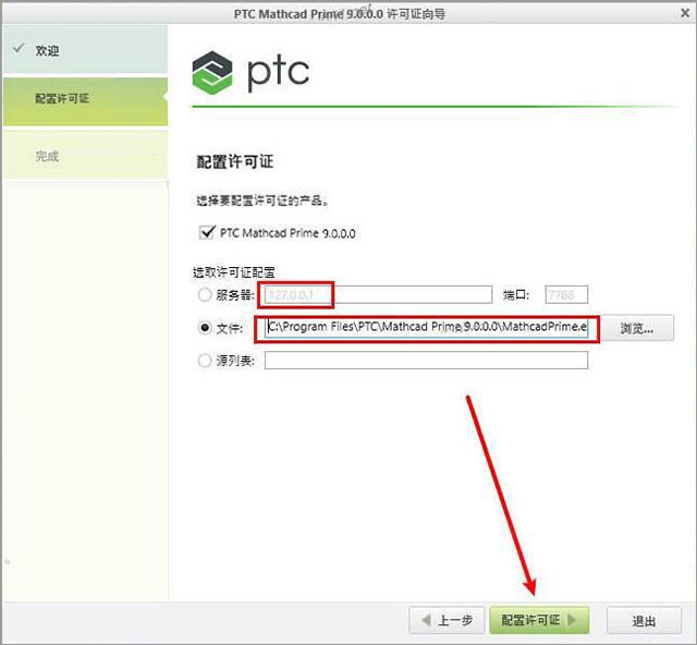 7、输入服务器127.0.0.1,选择浏览找到软件安装目录下的Mathcad Prime.exe,点击配置许可证即可;