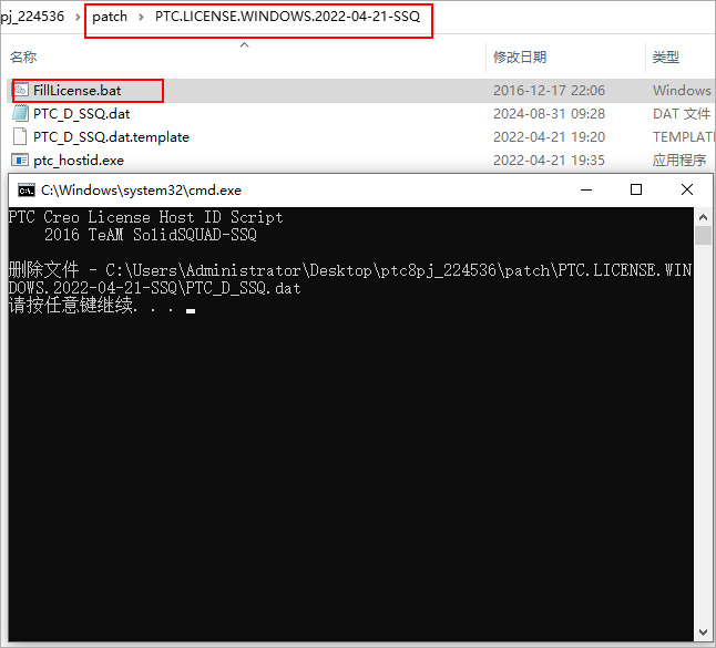 2、进入patch\PTC.LICENSE.WINDOWS.2022-04-21-SSQ文件夹,运行FillLicense.bat;