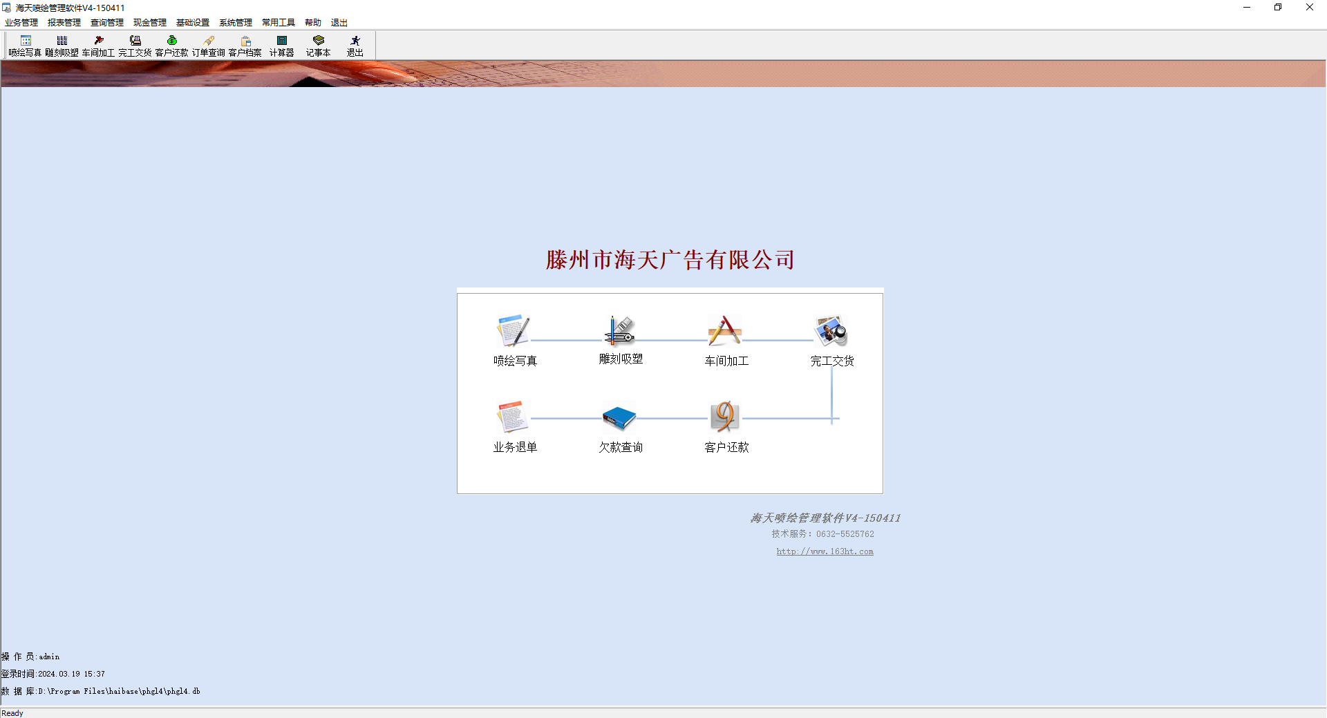 海天喷绘管理软件电脑版是针对喷绘行业推出的一款管理系统,为用户提供了业务管理、喷绘写真、车间加工、完工交货、现金管理、报表管理、查询管理、雕刻吸塑、客户还款等功能,能轻松让用户了解到详细的业绩,更好的管理公司账户信息,有效的提高工作效率。除此之外,海天喷绘管理软件还支持用户根据自身的使用需求来自主选择功能,非常的方便,并即使您是电脑新手也能在短时间内掌握此程序的基本操作流程,欢迎有兴趣的用户们免费下载体验。