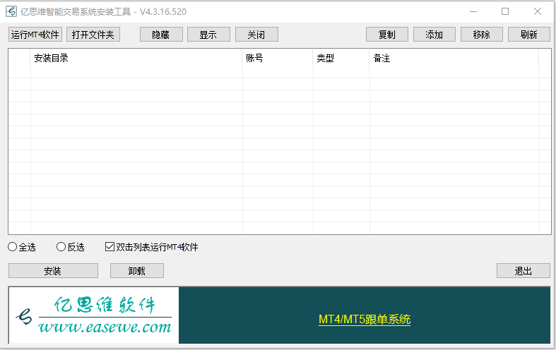 亿思维智能交易系统安装工具是一款非常实用的安装器,主要功能是帮助用户安装,且使用亿思维的各种交易软件,以及让你可以通过该软件来更好的运行mt4交易系统,并且这一就可以随时随地的进行快速开仓和平仓,是每位小伙伴使用mt4交易系统的必备的软件,欢迎有需要的用户们免费来本站下载体验!