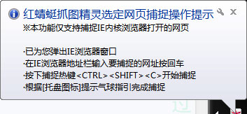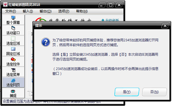 1、请运行打开红蜻蜓抓图精灵截图工具,然后选择左侧栏中的【选定网页】截屏方式。选择后弹出如下信息,两种方式,选是或否继续进行。