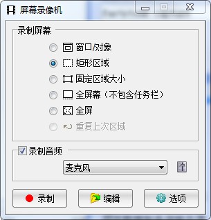 3、在这儿你可以选择矩形区域、固定区域大小等,以及还可以打开麦克风,点击录制;