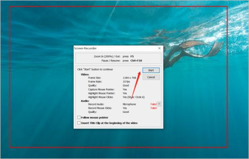 4、左击选择自己需要录制的区域,有效区域会显示红色框,划分好后,选择“start”即可开始录制视频;