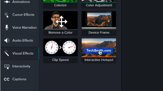 在Camtasia中打开视频后,将“删除颜色”效果从“工具”面板拖到时间轴上的剪辑。