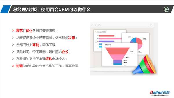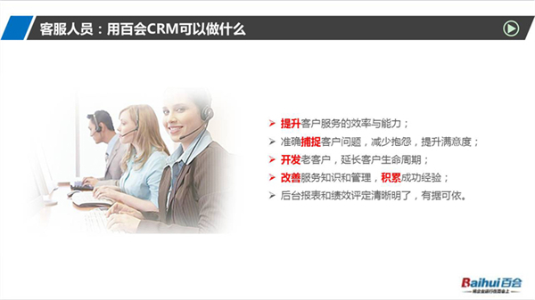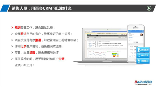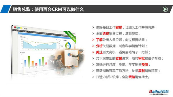 百会客户管理软件是一款集销售、服务和营销于一体的客户关系管理系统,简称为百会crm系统,软件能够精准管理客户关系,能够更好地将企业与客户关系的“三个维度(即宽度、远度、深度)”做到极致,有效缩短销售周期,帮助企业获得显著效益,实现企业利润的快速增长。