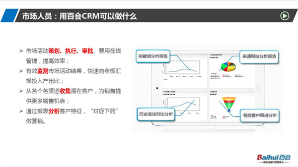 百会客户管理软件帮您收集各种途径得来的潜在客户信息,微信、名片、网上收集的web表单、呼叫中心......你所能想到的营销手段,都能以最简单的方式快速导入CRM中跟进,适应信息化时代营销模式。