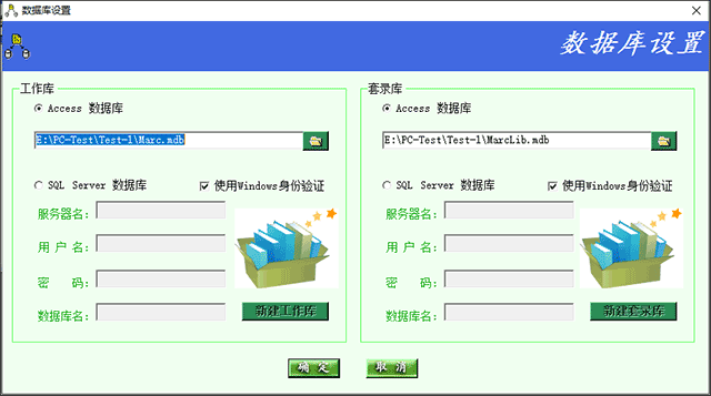 说明:在界面中可分别对工作库和套录库选择是采用何种数据库,并设置对应文件和相关参数。可在界面中直接新建SQL数据库,如果需要新建Access数据库,可直接在安装目录中找到对应的数据库文件(Marc.mdb是工作库文件,MarcLib.mdb是套录库文件)进行复制即可。点击“确定”按钮完成操作。套录库用来存放已有的MARC数据,并注意及时导入新制作的MARC数据以便于MARC录入时套录; 工作库用来存放对正在为某个客户制作的MARC数据,由于每个客户的MARC制作要求不同,所以建议每个客户建一个工作库,要制作哪个客户的MARC数据,就连接哪个数据库,这样对不同客户制作MARC互不干扰,便于按照客户来进行管理。