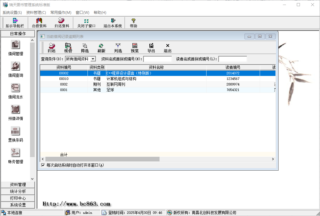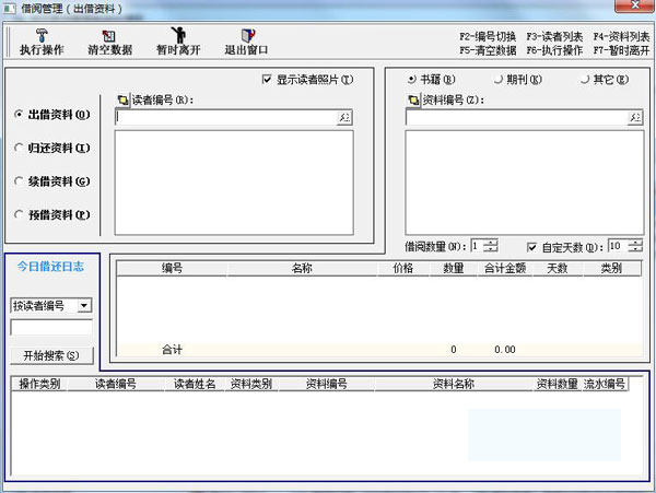 1、借阅管理,可以对出借资料、归还资料、续借资料和预借资料进行管理;
