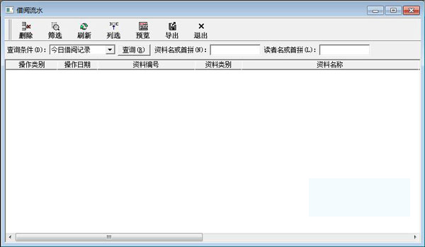 3、借阅流水,可以按照查询条件、资料名或者首拼、读者名或者首拼进行借阅流水查询;