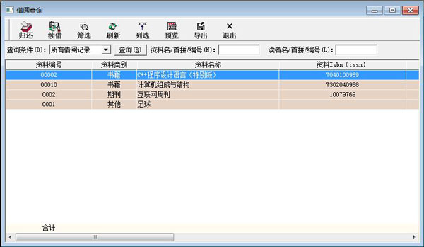 2、借阅查询,可以对图书的归还、续借、筛选等图书借阅信息进行查询;