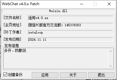 微信电脑版多开补丁是专为微信pc版而开发的多开补丁文件,能够适用于v4.0.x以上版本,用户只需将补丁放到安装位置的[4.0.x.x]文件夹使用说明: 请将补丁放到安装位置的 [4.0.x.x] 文件夹内执行.目录执行即可。但需要注意:一些杀毒软件可能会误报,如误报请加白名单即可,亲测可用,请放心下载体验。