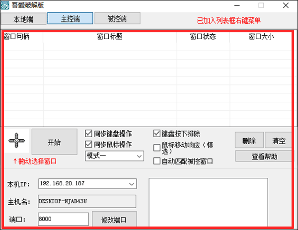 被控端--填写主机IP--填写端口(主机IP和端口在主控端查看)--点击连接--选择游戏窗口--选择模式--启动--回到主控端(这时主控端右下角的框里应该会显示被控端的IP和端口)--选择游戏窗口--启动
