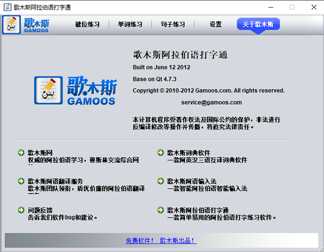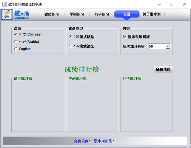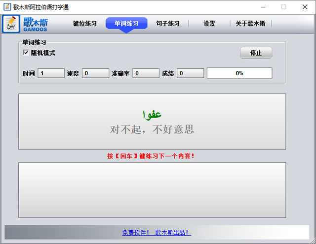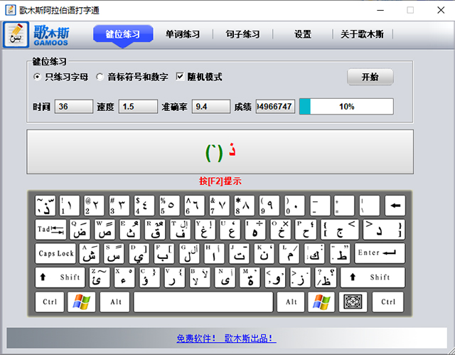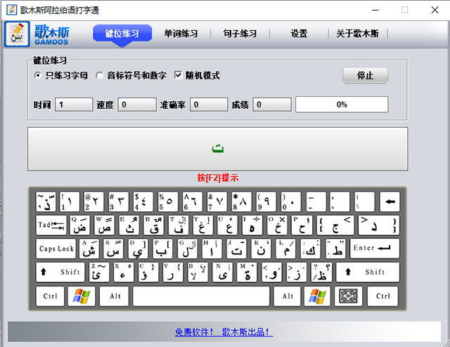 歌木斯阿拉伯语打字通官方版是一款电脑学习阿拉伯语的打字练习软件,拥有键位练习,单词练习,句子练习三大模块,支持设置阿拉伯语,英语,汉语三种界面,能够帮助用户快速学习阿拉伯语,用户无需安装任何阿拉伯语输入法,其内置的输入法可以帮助用户快速打出阿拉伯语,适用于想学阿拉伯语的朋友使用。