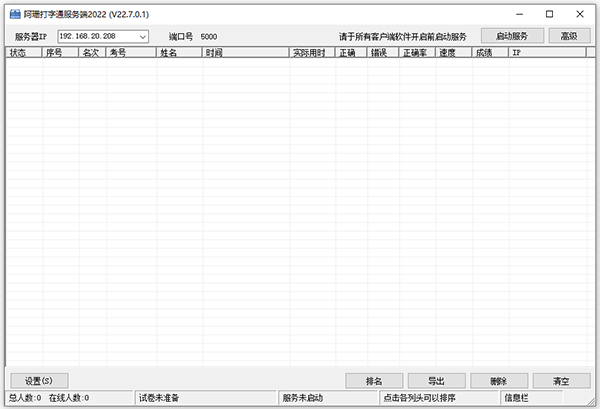 内网模式使用时,需先打开服务端,并启动服务。服务端具备排名、排序功能,还可以将成绩导出为Excel表格。