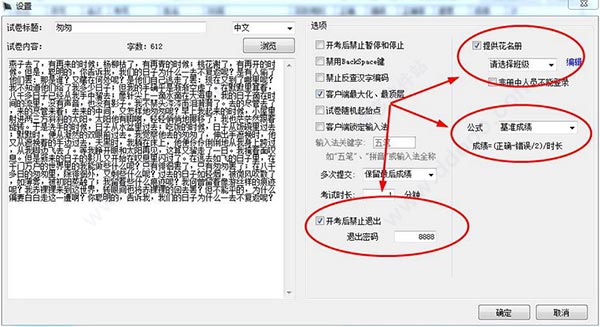 5、例如,我选择了一篇《匆匆》,并勾选“客户端最大化、最顶层”,以防考生开小差打游戏等,勾选了“开考后禁止中途退出”,以免考生中途退出考试,实在要退出的也要凭密码。还可以设置学生花名册、自定义成绩公式等。